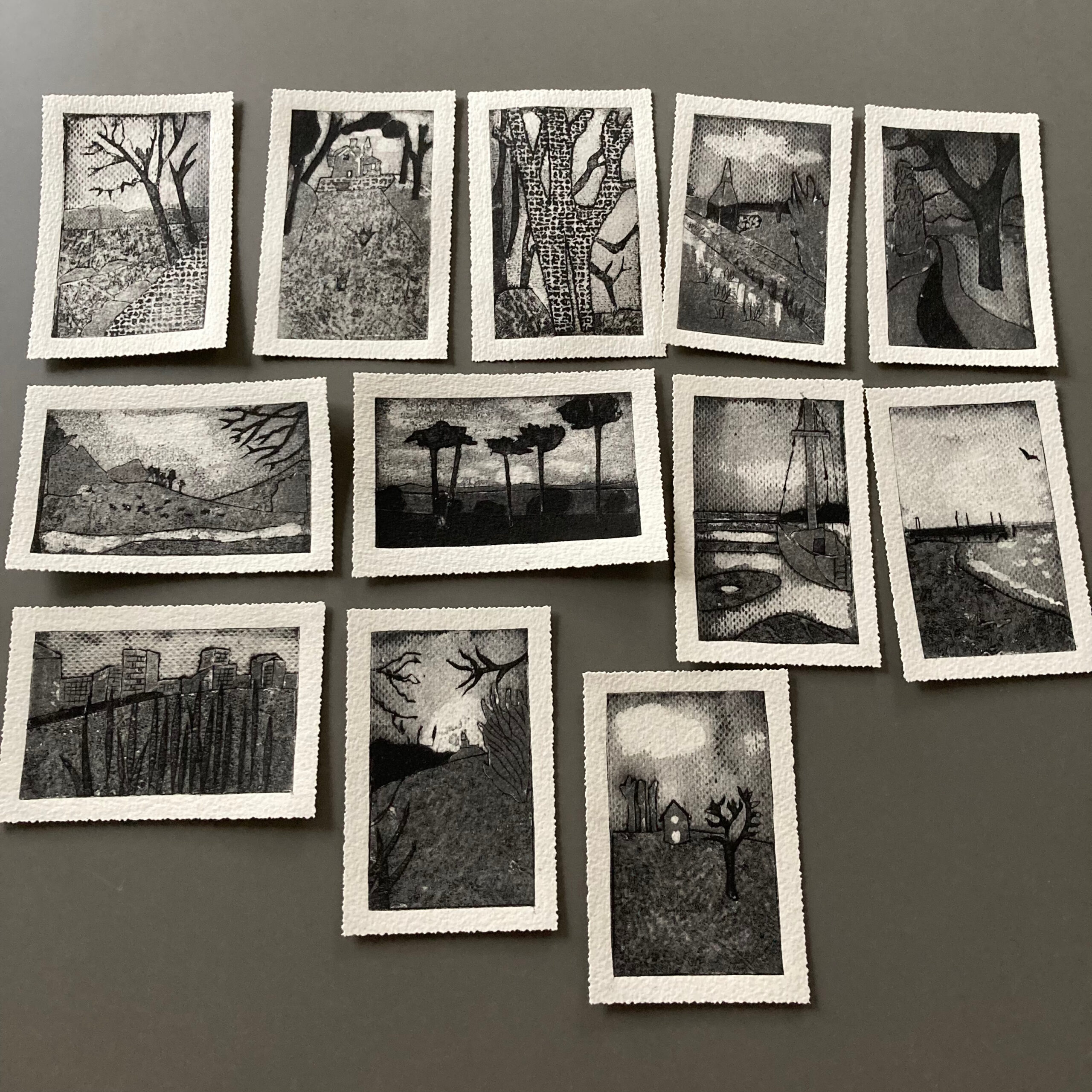 JC, mars 2025, « Collagraphie téléphoniques » collagraphies sur papier aquarelle à partir de photographies de téléphone portable.